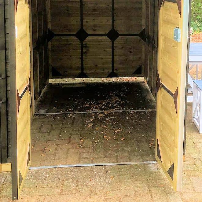 Bakfietsenberging 150270 met vast dak heeft in tegenstelling tot onze andere bakfietsbergingen. Deze uitvoering berging heeft een prettige stahoogte van 205 cm. Makkelijk in- en uitrijden doordat deze berging geen drempels heeft.