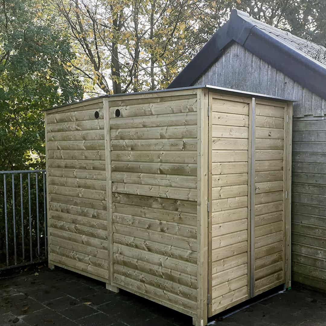 Zo staat je bakfiets veilig beschermd en droog. Beschermd doordat deze afsluitbaar is met een draaislot en door de grond strips die in de bestrating verankerd kunnen worden.