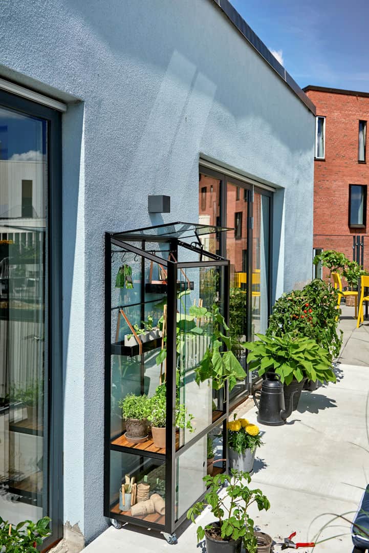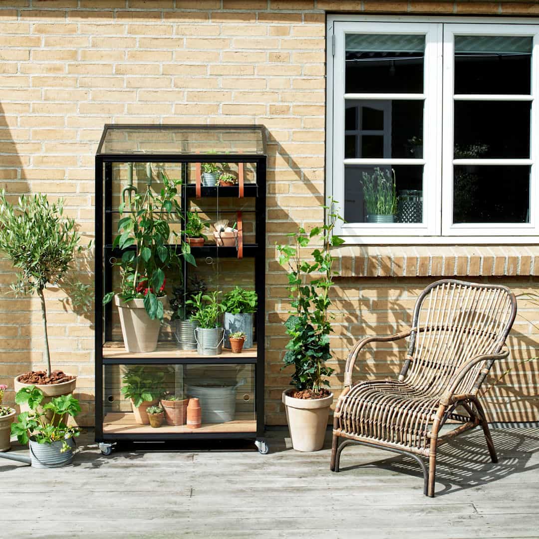 Een sfeervolle en verrijdbare kas die altijd op een kleine oppervlakte een plekje zal vinden.