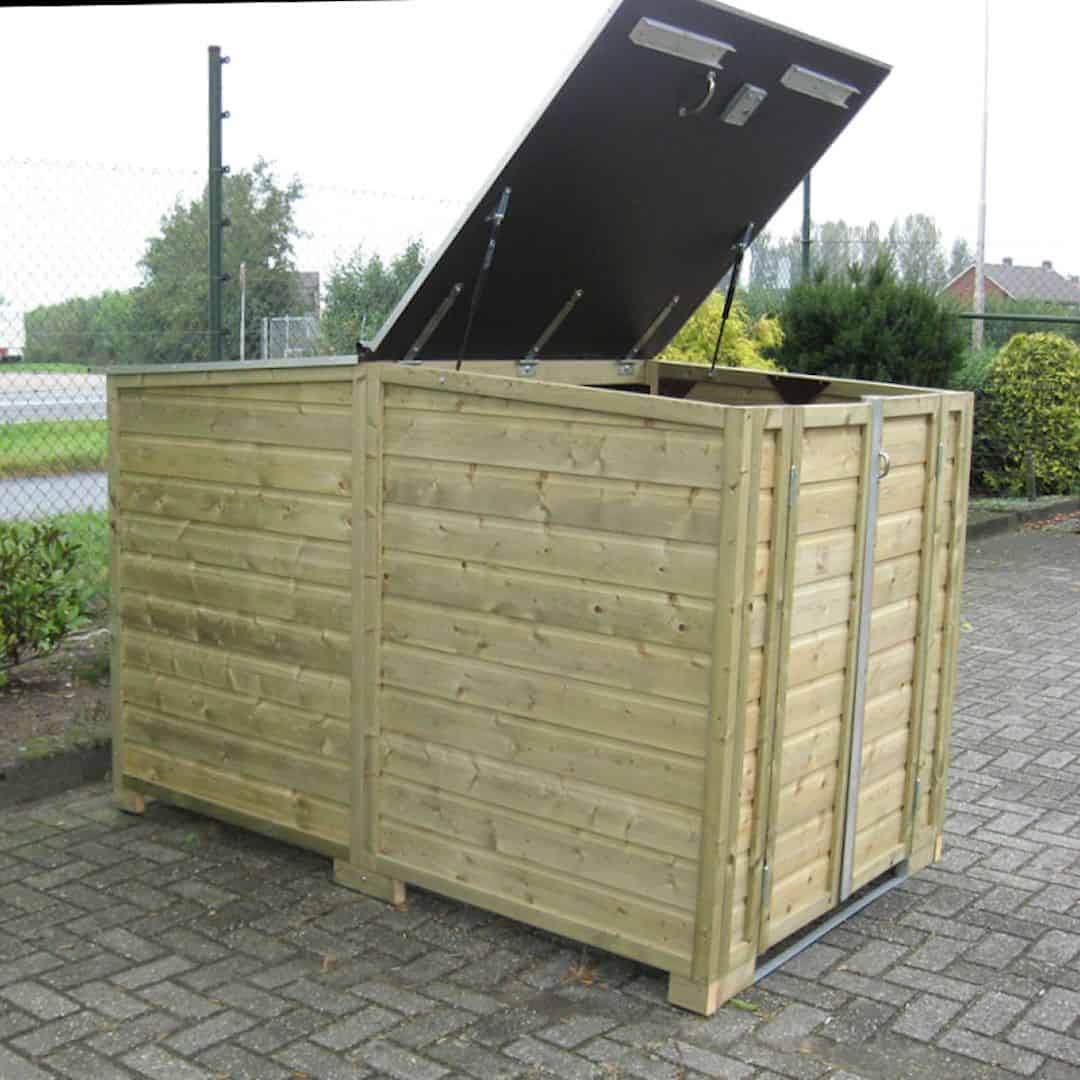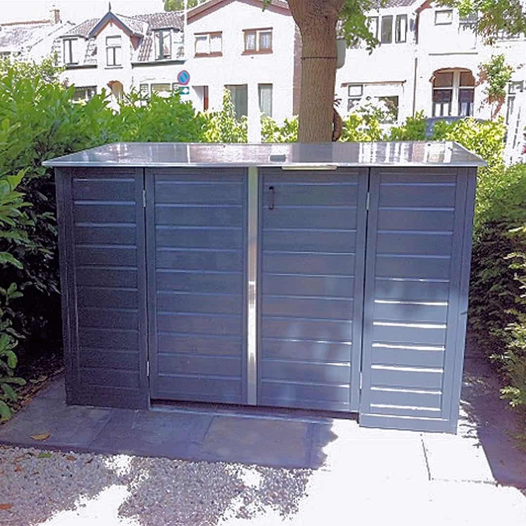 Deze fietsenberging met beweegbare deksel heeft het voordeel dat het een laag model is.