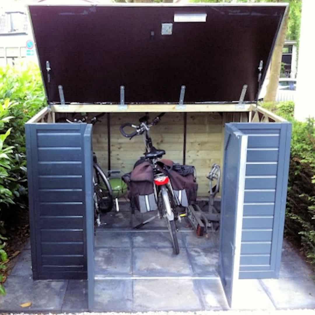 Deze fietsberging is voorzien van gasveren is de beweegbare deksel makkelijk te openen en te sluiten.