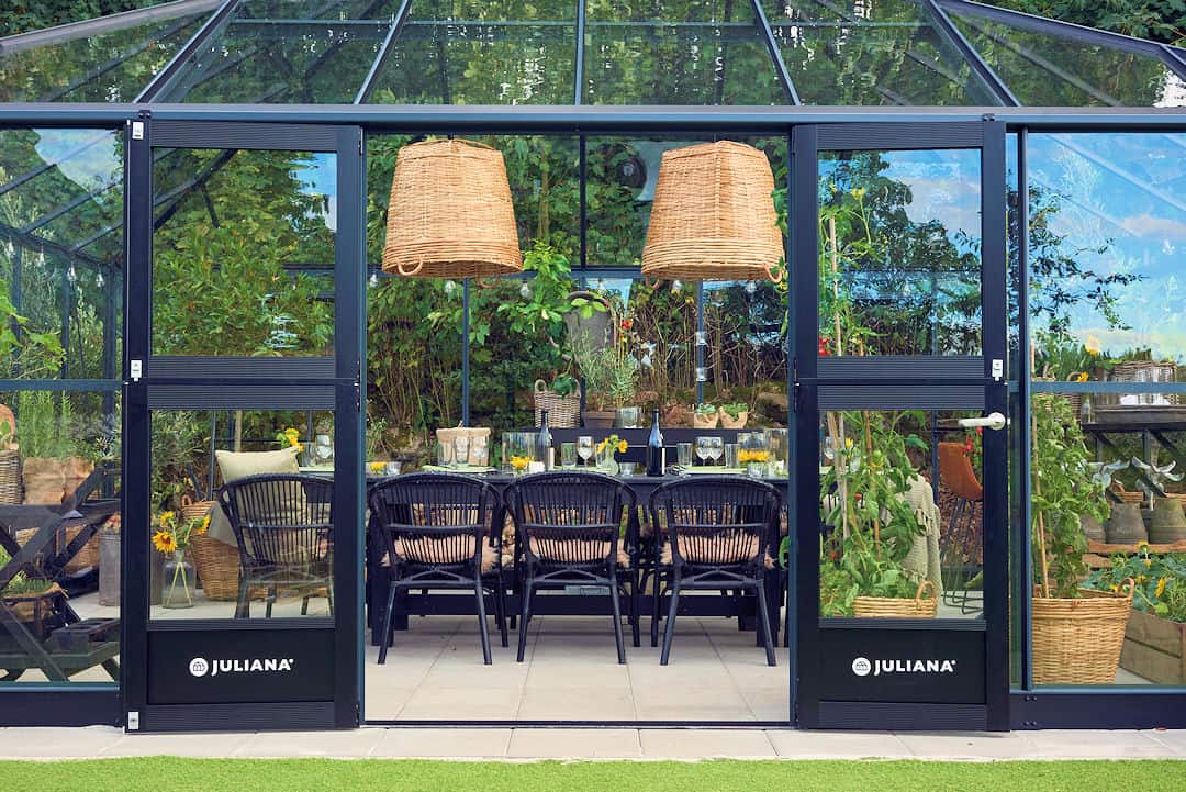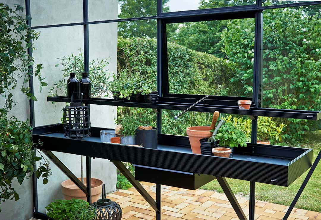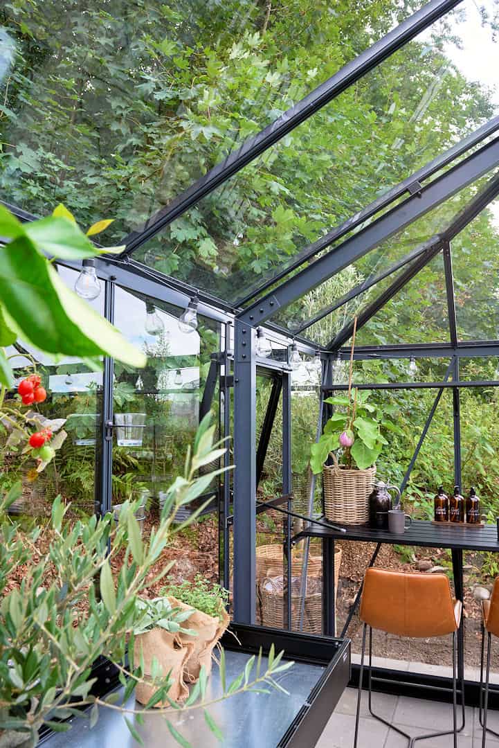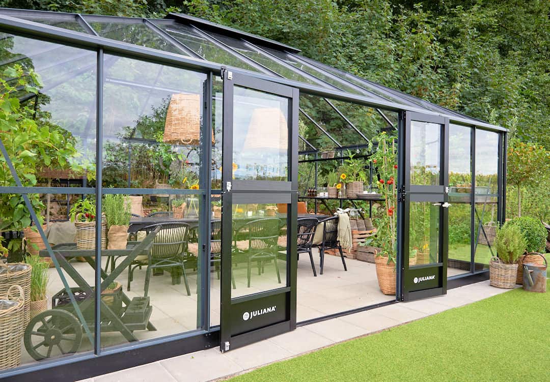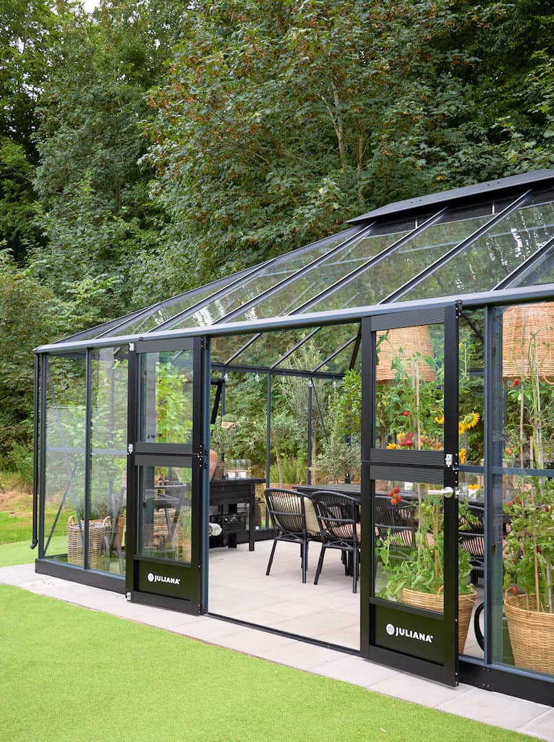 Dankzij het verzonken dorpelprofiel en een deelbare scharnierdeur is de toegang tot de kas optimaal.