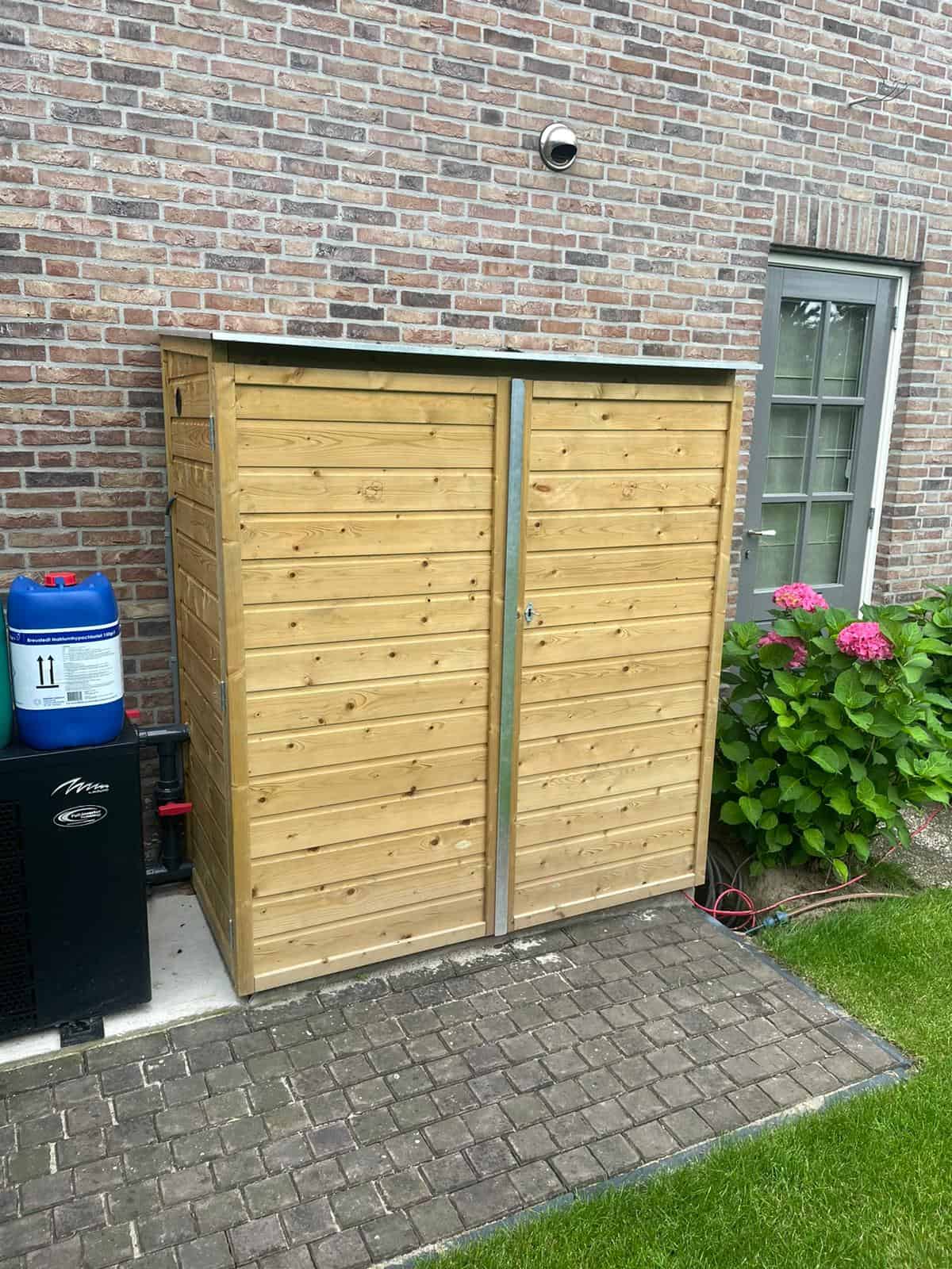 De hoogte van deze kliko-tuinkast is gunstig, want deze komt nu boven de tuinschutting hoogte uit