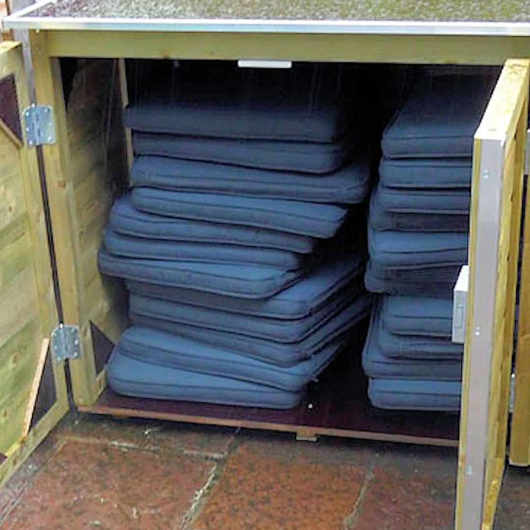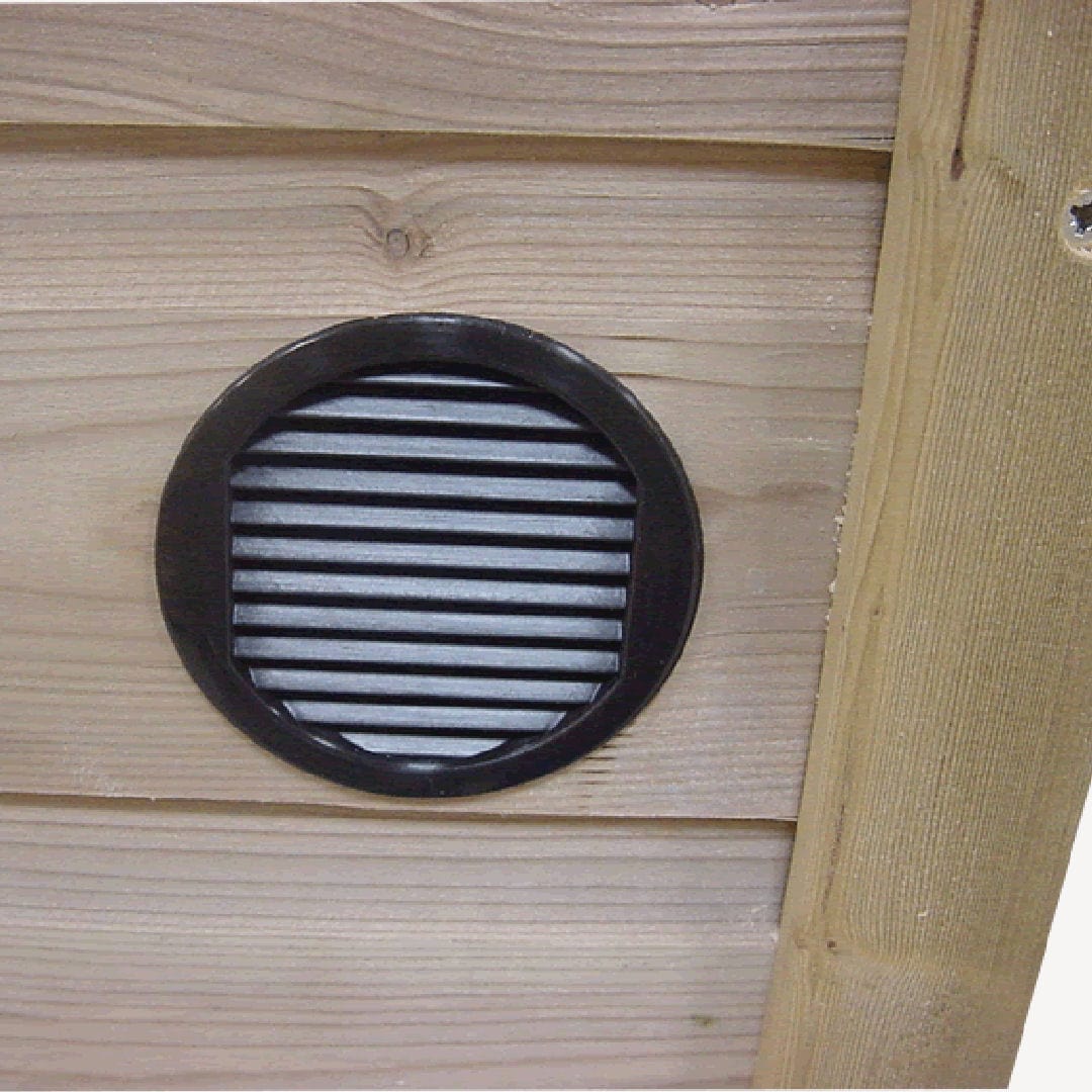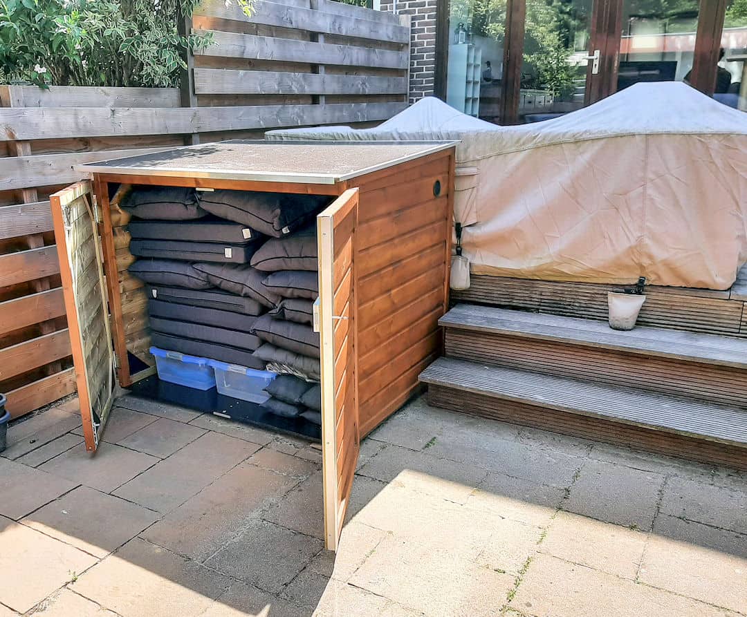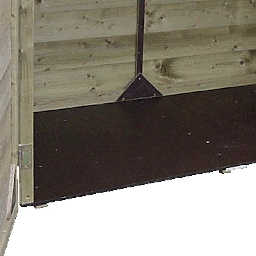 Aan de onderzijde van deze tuinkast bevinden zich onder balkjes zodat deze van de ondergrond af staat i.v.m. ventilatie.