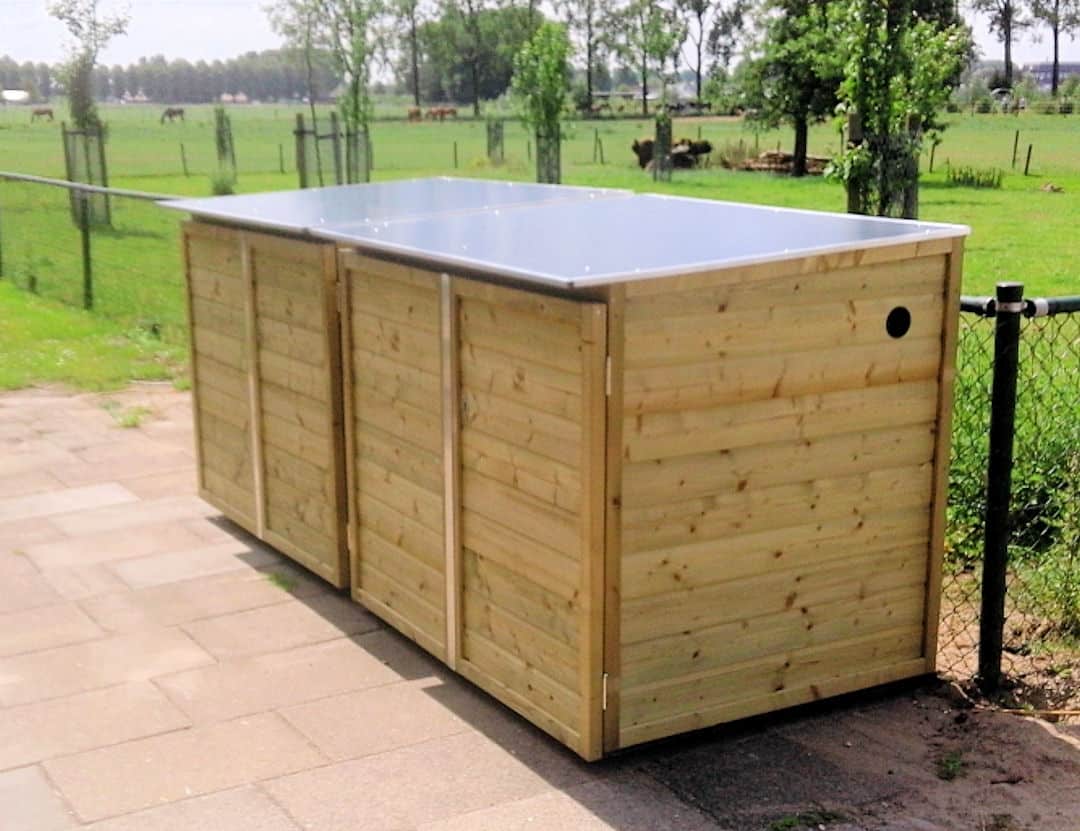 De wanden zijn van vurenhout onder KOMO-keur geïmpregneerd. Deze zullen gaan vergrijzen door weerinvloeden.