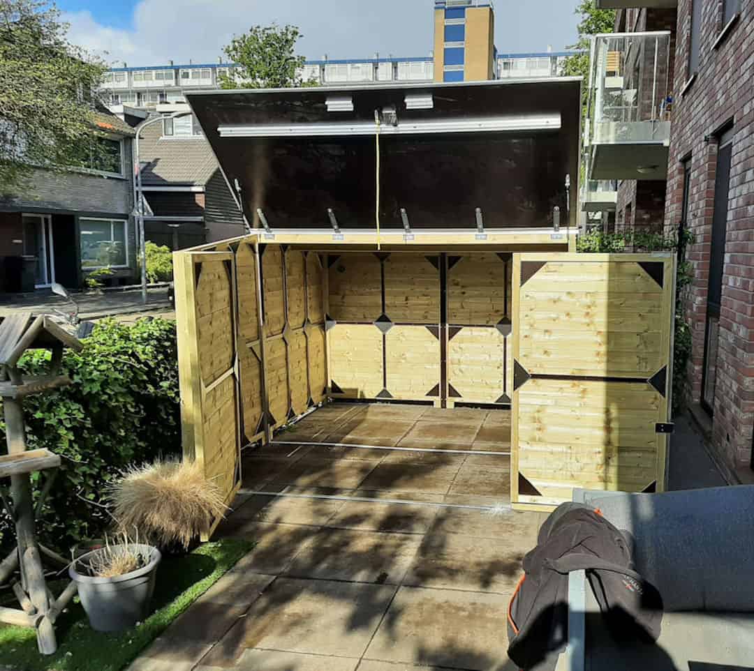 Neemt weinig zicht weg in tegenstelling tot een hoog schuurtje door de beweegbare deksel.