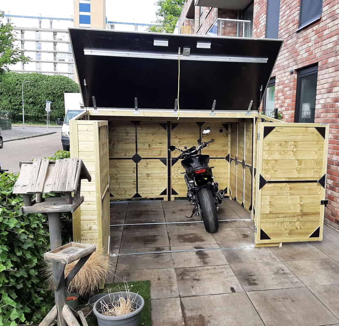 -Aan de onderzijde van deze slimme motorberging tref je een grondbeugel aan zodat je deze