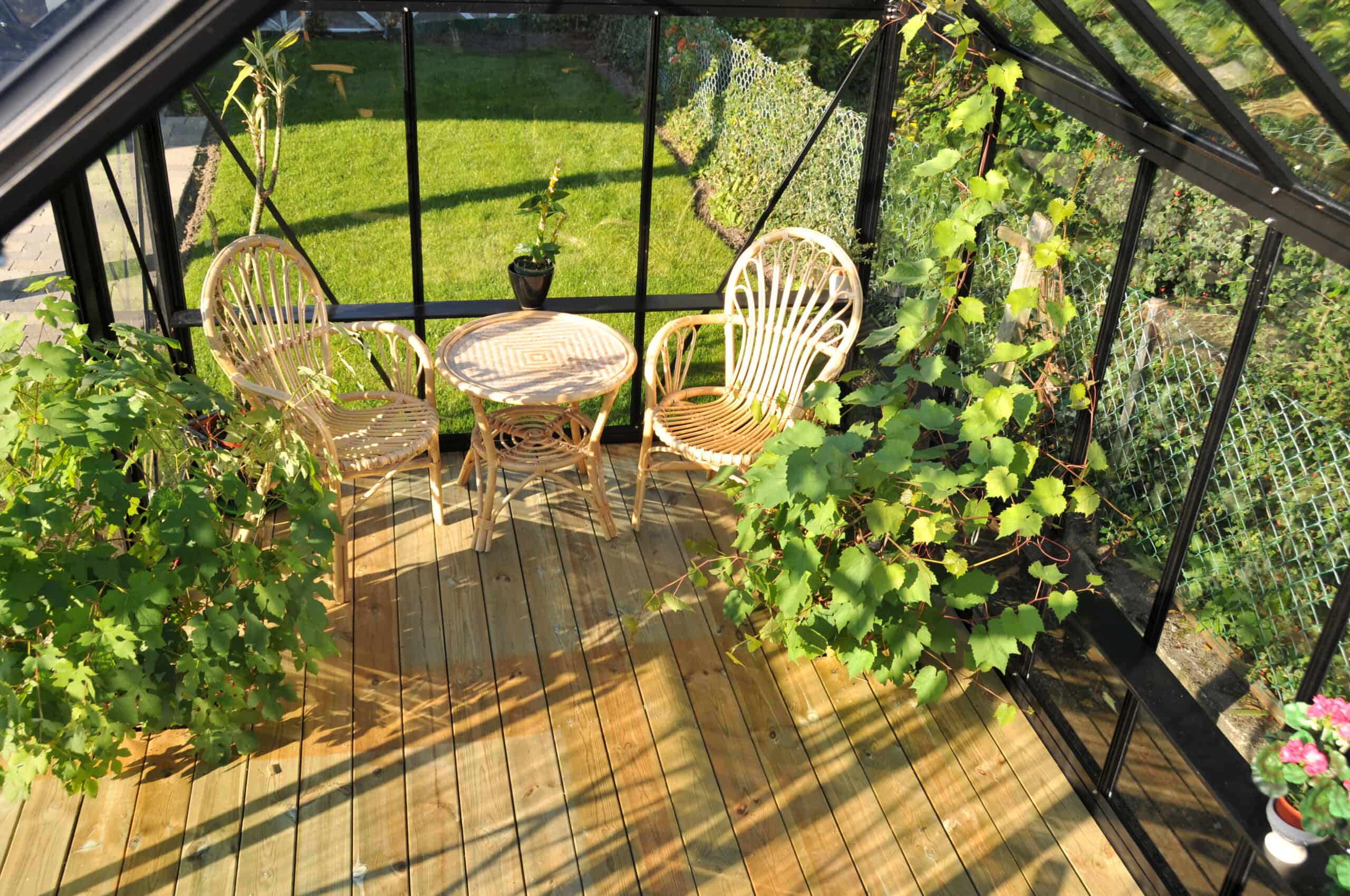 6 mm dik en dubbelwandig polycarbonaat voor het dak en 3 mm dik veiligheidsglas voor de zijwanden, deuren en ramen.