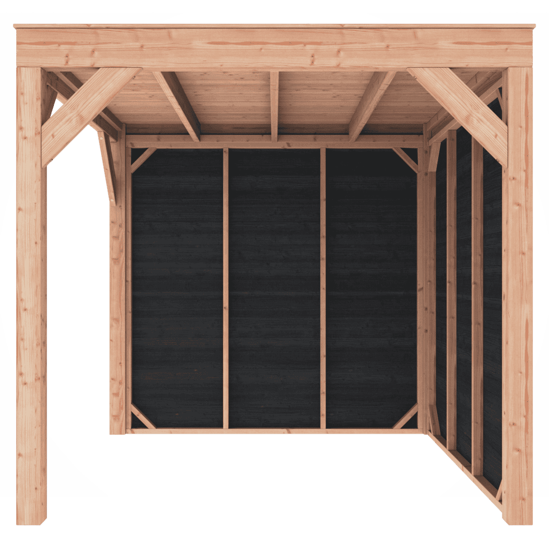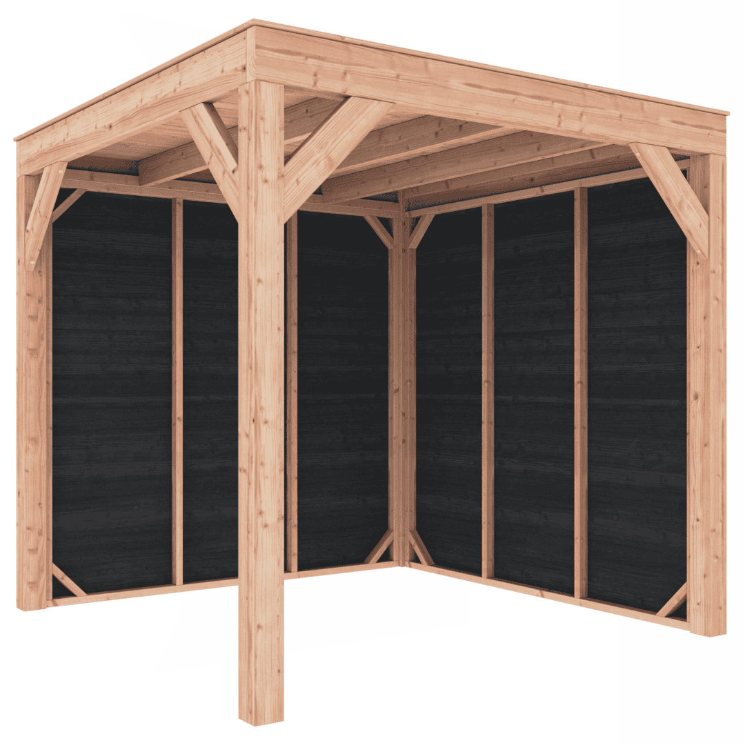 Deze Overkapping Douglas 250×250 met wanden wordt zonder dakbedekking geleverd.