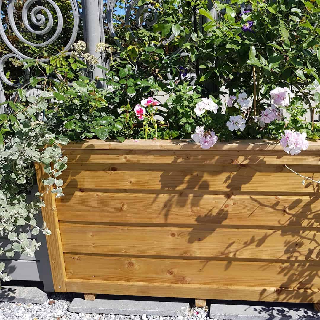 De plantenbak staat op balkjes, waardoor er luchtcirculatie onder de bak plaatsvindt en de levensduur verder wordt verlengd. Zowel de boven- als onderzijde zijn voorzien van verstevigde hoeken, en de bovenzijde heeft een fraaie afwerkrand die het geheel een verzorgde uitstraling geeft.