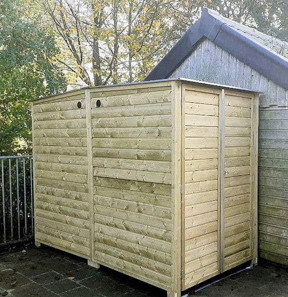 Scootmobielberging 150270214 kan voldoende ventileren door de open ruimtes aan onderzijde van de wanden.