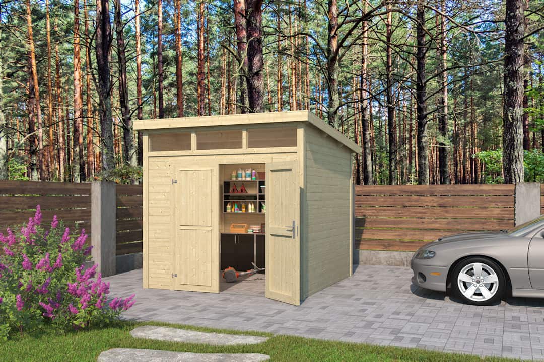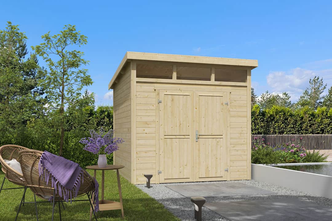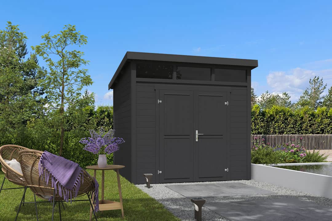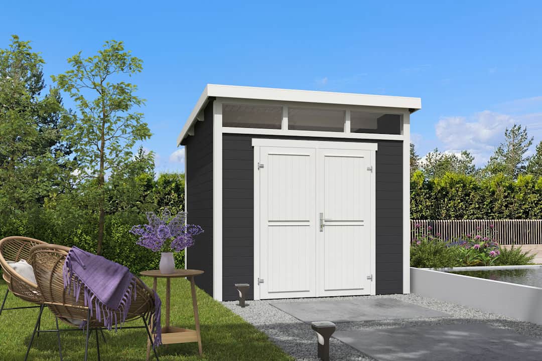 Tuinhuis Kibo 3 250×250 met lessenaarsdak en dubbele deur.