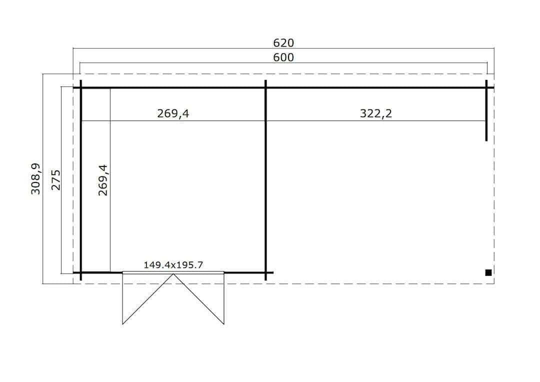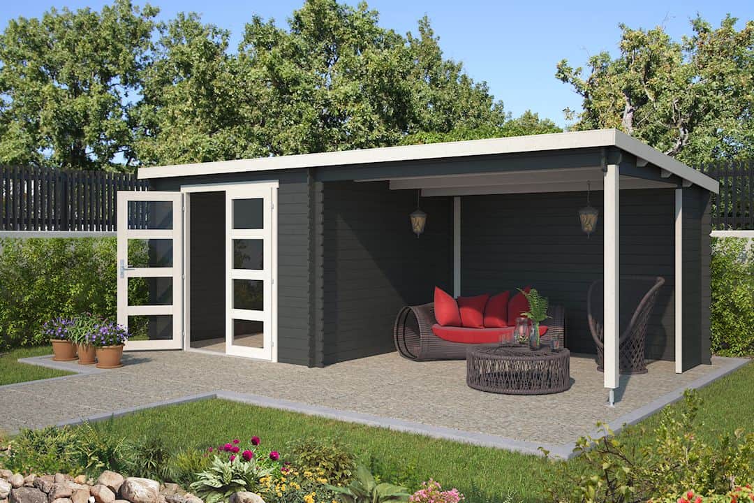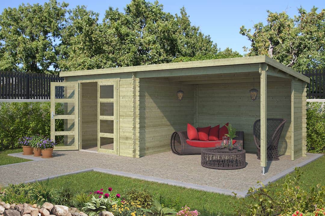 Type: Tuinhuis Manuel met grote overkapping voor een comfortabele zithoek.