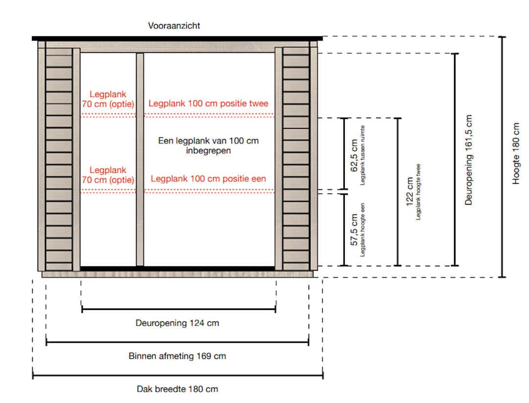 De wanden zijn van vurenhout onder KOMO-keur geïmpregneerd. Deze zullen gaan vergrijzen door weersinvloeden.