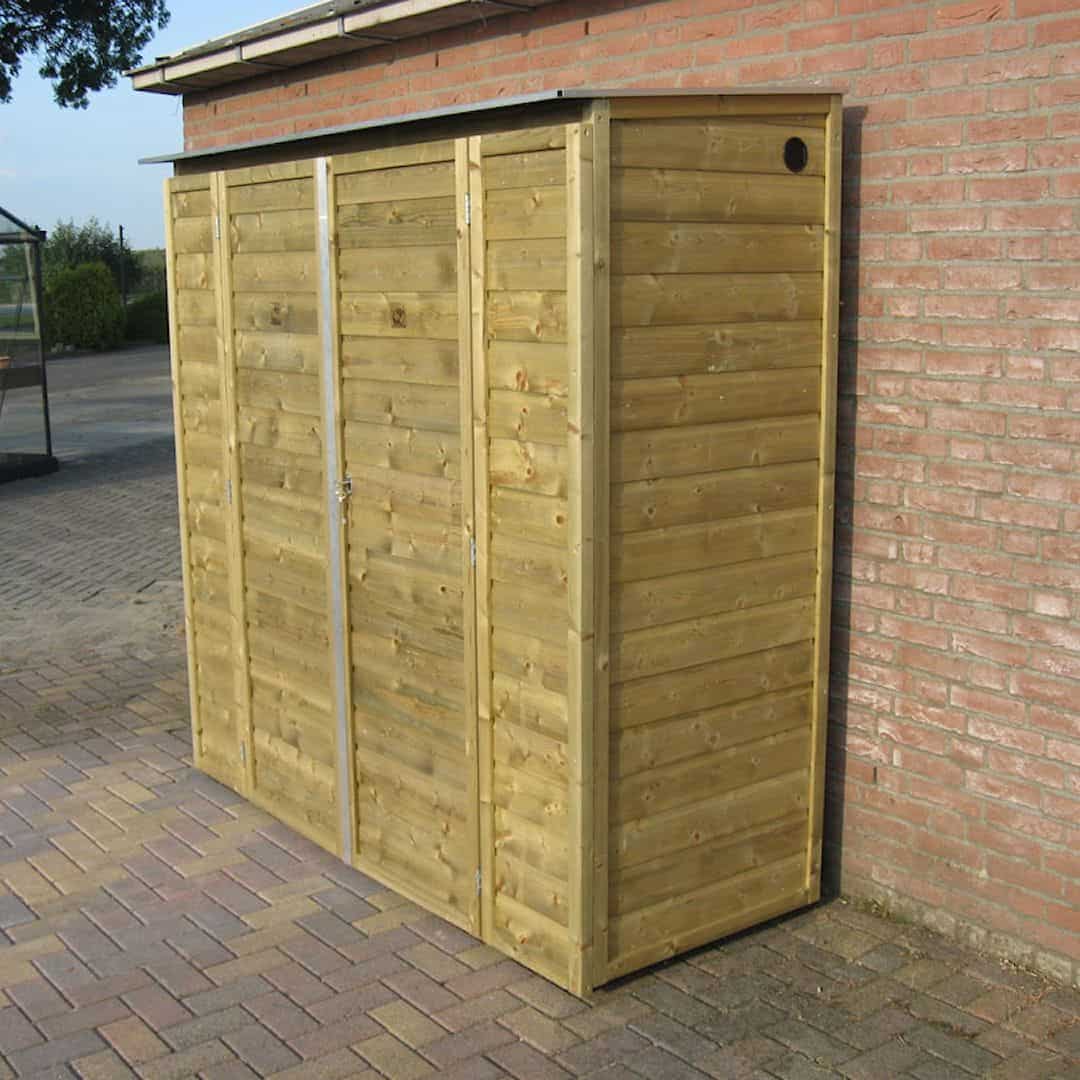 Aan de onderzijde van deze tuinkast bevinden zich balkjes zodat deze van de ondergrond af staat i.v.m. ventilatie.