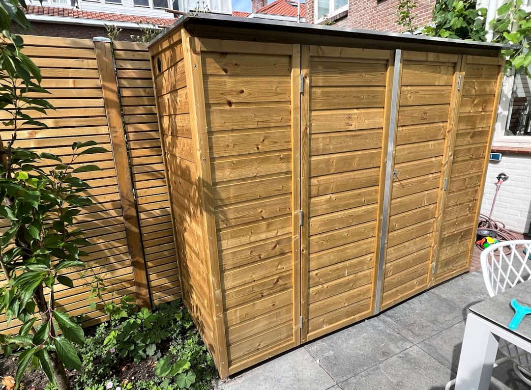Aan de onderzijde van deze tuinkast bevinden zich balkjes zodat deze van de ondergrond af staat i.v.m. ventilatie.