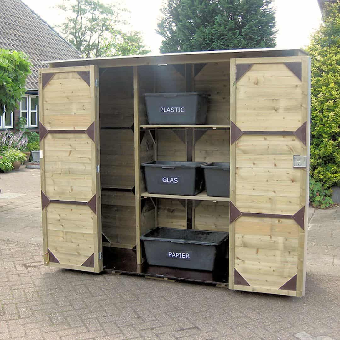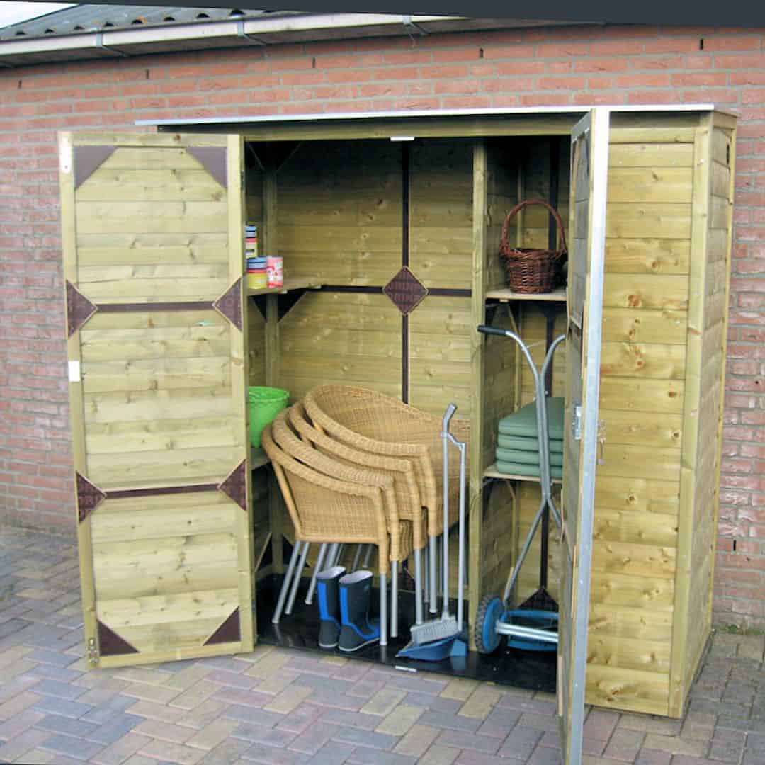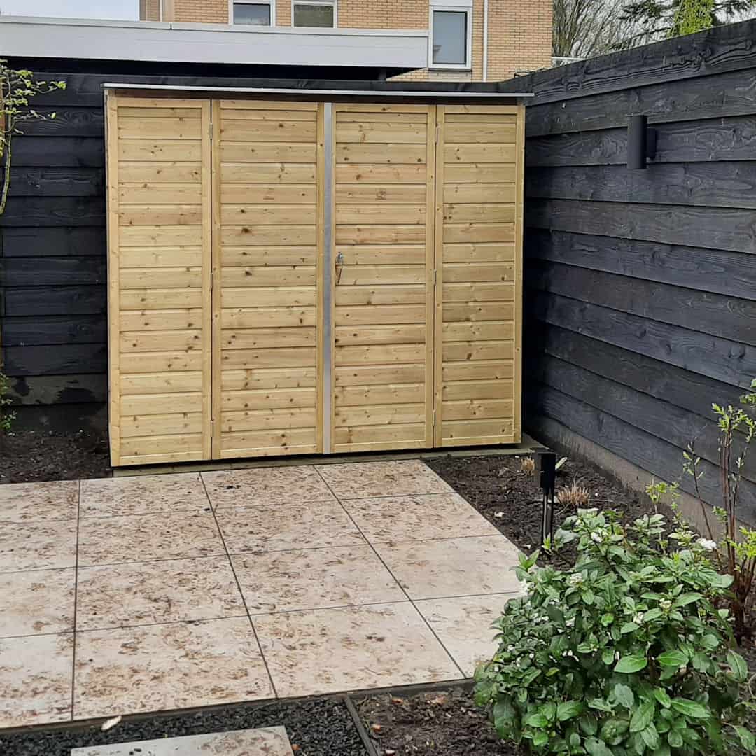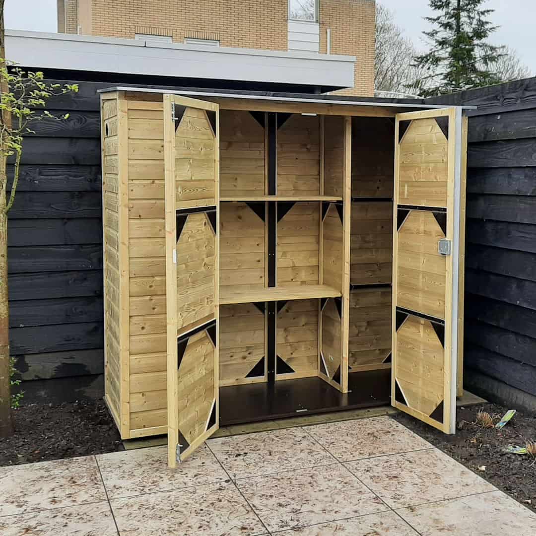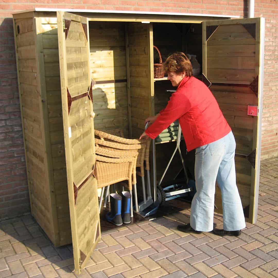 Deze tuinkast is makkelijk toegankelijk door de dubbele draaideuren met slot.