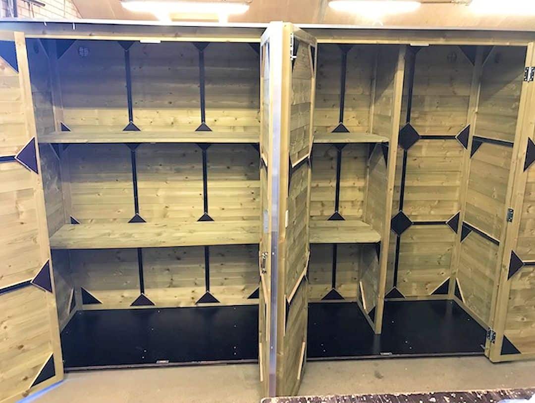 Deze tuinkast is makkelijk toegankelijk door de dubbele draaideuren met slot.