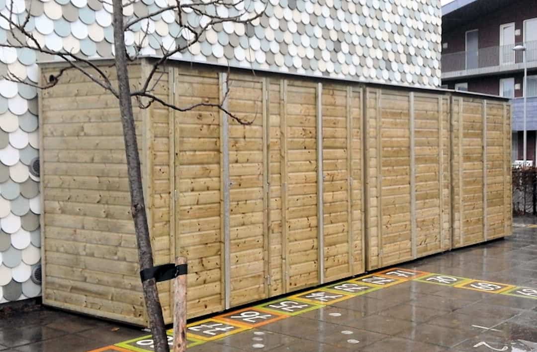 De wanden zijn van vurenhout onder KOMO-keur geïmpregneerd. Deze zullen gaan vergrijzen door weerinvloeden.