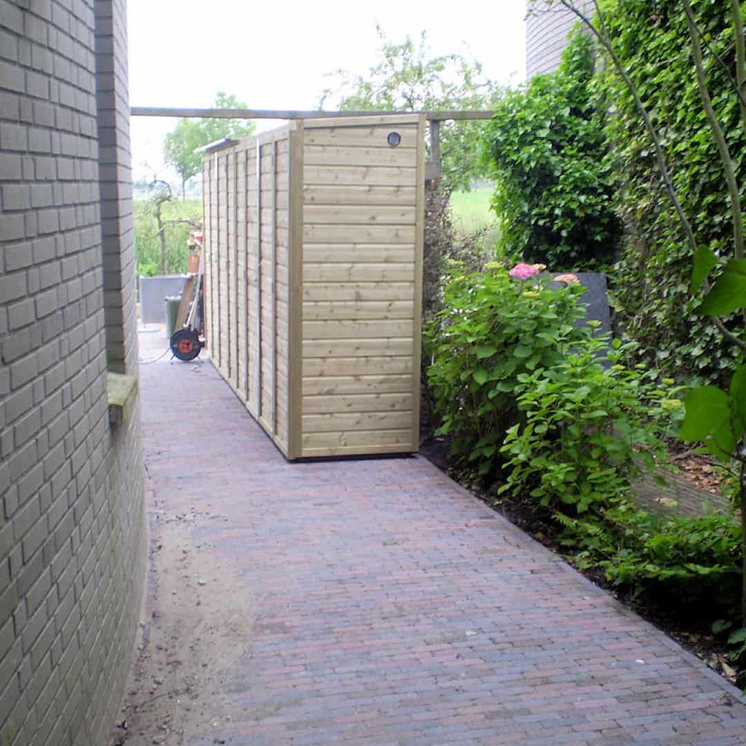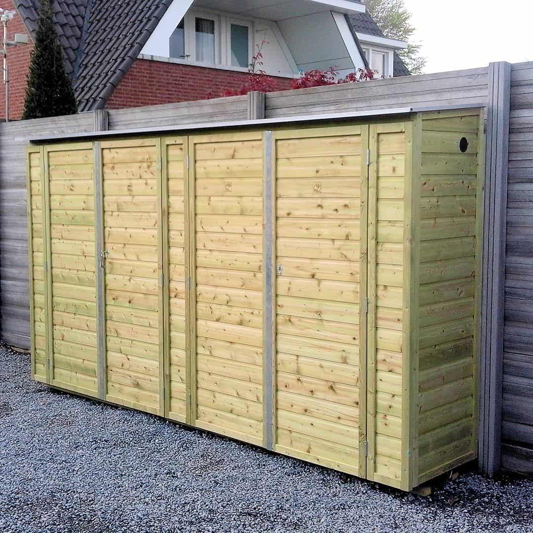 De breedte maat van 305 cm is de grootste maat in ons assortiment van de houten tuinkasten.