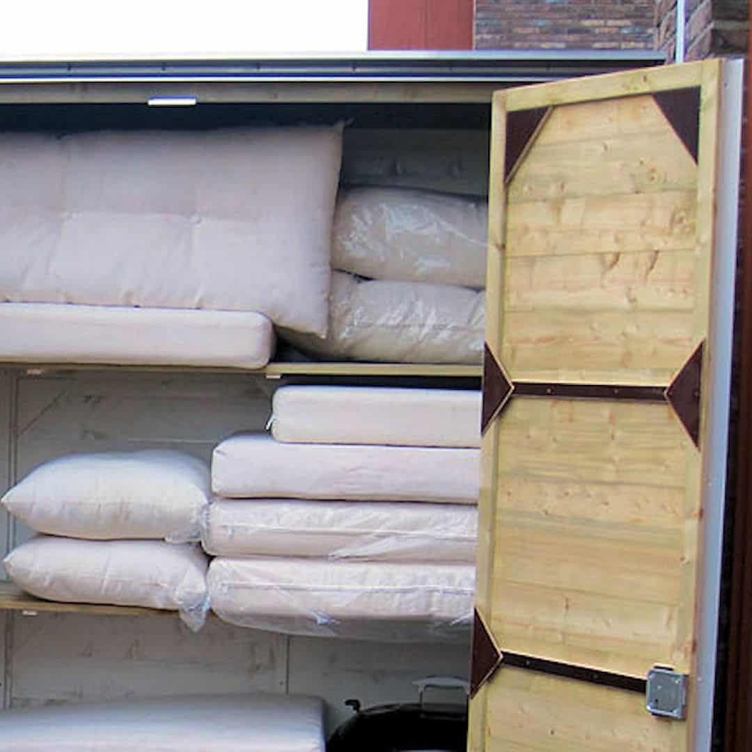 Aan de onderzijde van deze tuinkast bevinden zich balkjes zodat deze van de ondergrond af staat i.v.m. ventilatie.