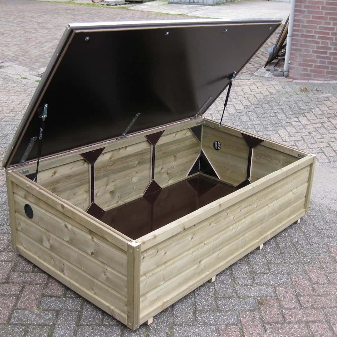 Hierdoor blijft het deksel vaststaan en klapt niet spontaan dicht. Zodoende heb je beide handen vrij om de benodigde spullen in en uit de tuinkist te pakken.