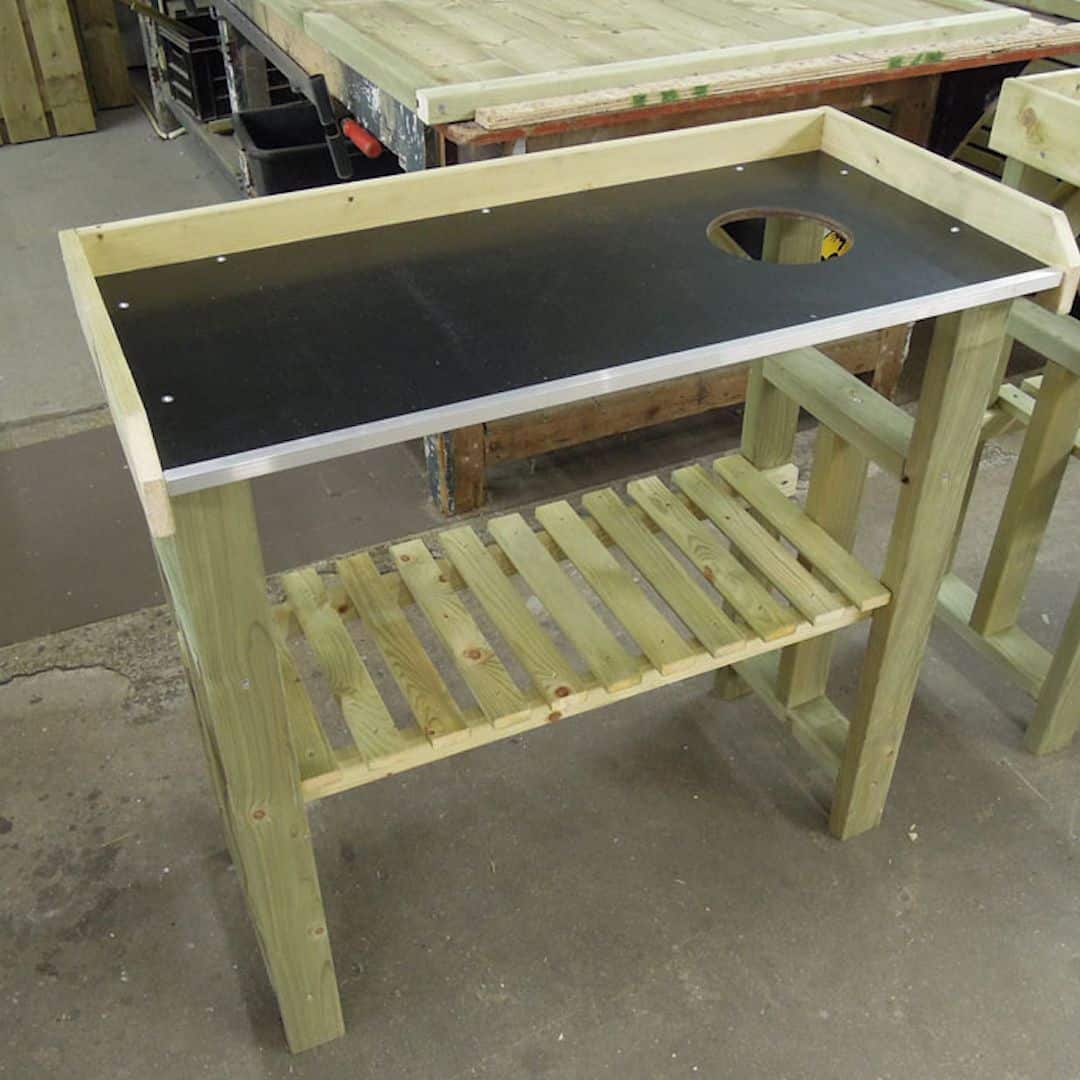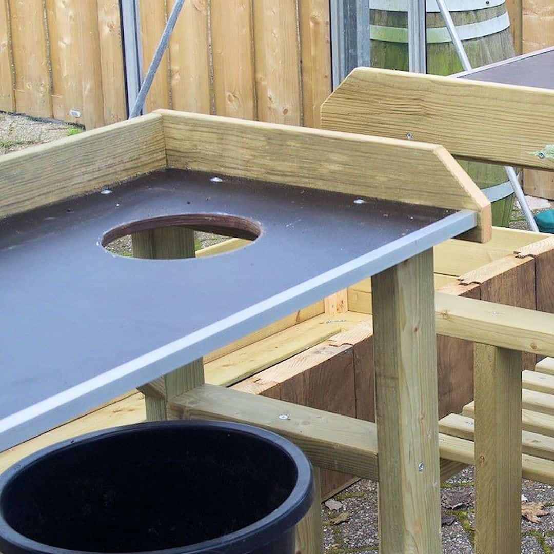 Een bijzonder kenmerk van de tafel is de uitsparing met een diameter van 150 mm, perfect voor een pot of afvalemmer. Dit maakt het verpotten van planten nog gemakkelijker en schoner. Daarnaast kunt u zelf de hoogte van het onderblad bepalen, zodat u de tafel optimaal kunt afstemmen op uw behoeften.