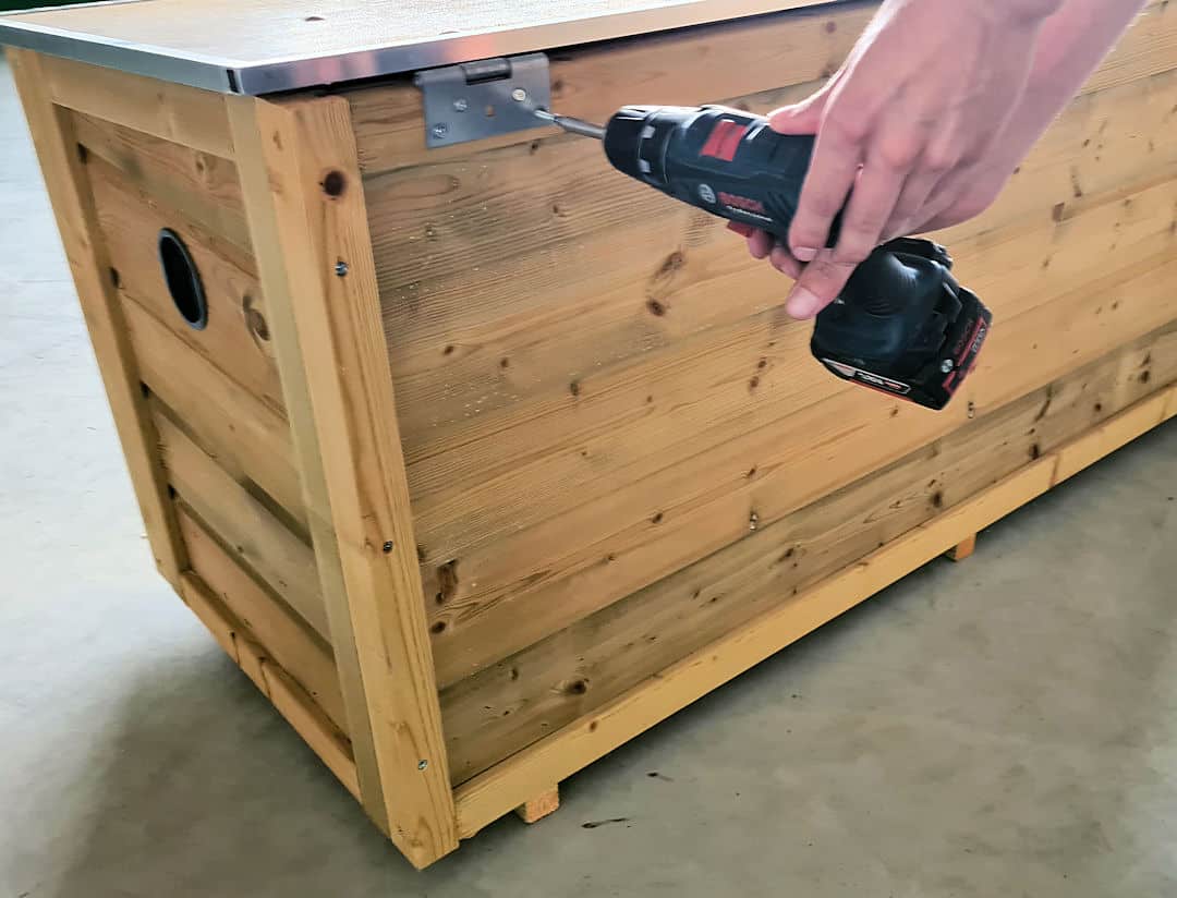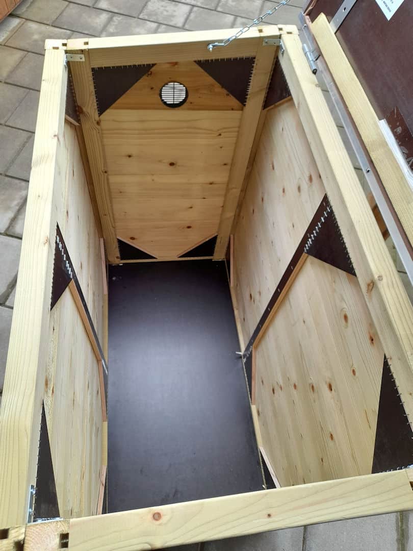 De stormkettingen aan weerszijden zorgen ervoor dat bij harde wind het deksel niet naar achteren kan klappen.